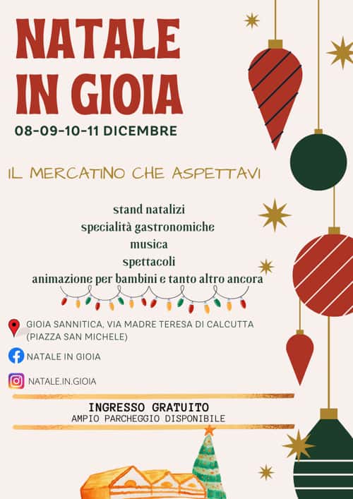 Natale in Gioia vi aspetta a Gioia Sannitica in provincia di Caserta in Piazza Giovanni Paolo II il 2-3 Dicembre 2023 e dal 7 al