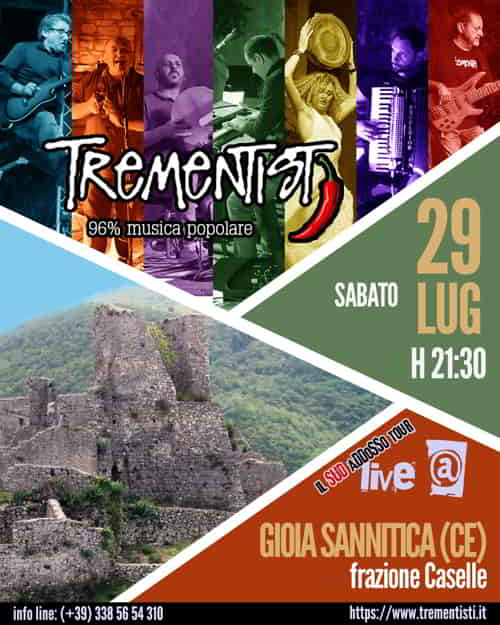 Il 29 Luglio 2023, a Gioia Sannitica in provincia di Caserta, frazione Caselle concerto dei Trementisti – Il Sud Addosso, in Piazza Pasquale Saponaro. Info