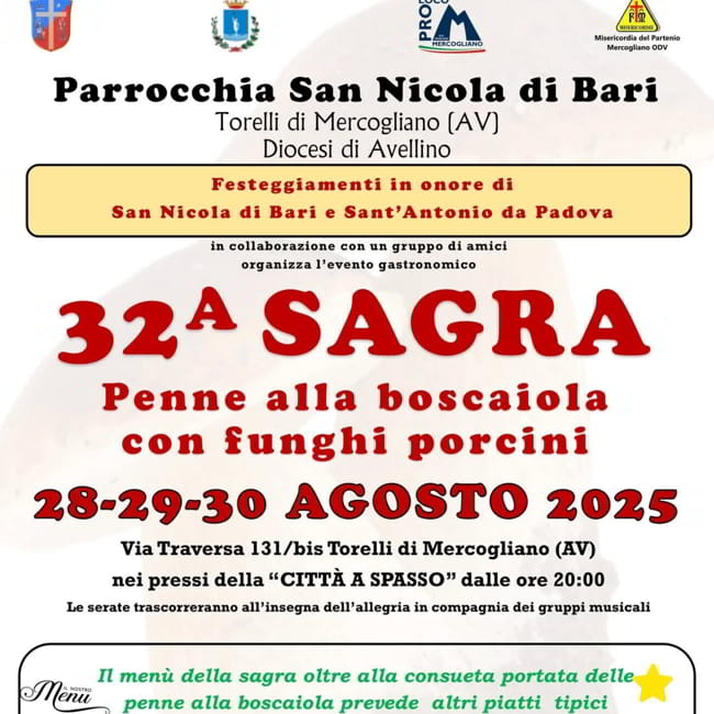La Parrocchia San Nicola di Bari organizza la 32Β° edizione della Sagra delle Penne alla Boscaiola con Funghi Porcini, dal 28 al 30 Agosto 2025