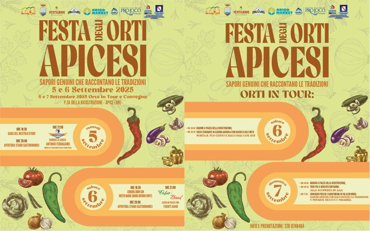Il 5, 6 e 7 Settembre 2025, ad Apice in provincia di Benevento, la Pro Loco organizza la 12esima edizione della Sagra degli Orti Apicesi.