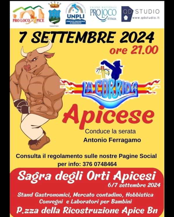 In occasione dell’11esima edizione della Sagra degli orti Apicesi, la Pro Loco organizza, per il 7 Settembre 2024, la Corrida….dilettanti allo Sbaraglio.