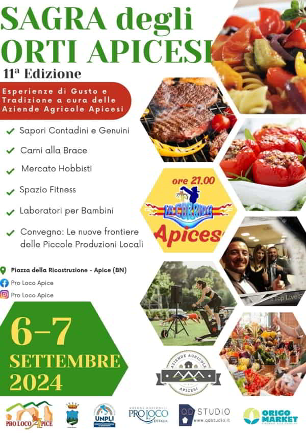 Il 5, 6 e 7 Settembre 2025, ad Apice in provincia di Benevento, la Pro Loco organizza la 12esima edizione della Sagra degli Orti Apicesi.