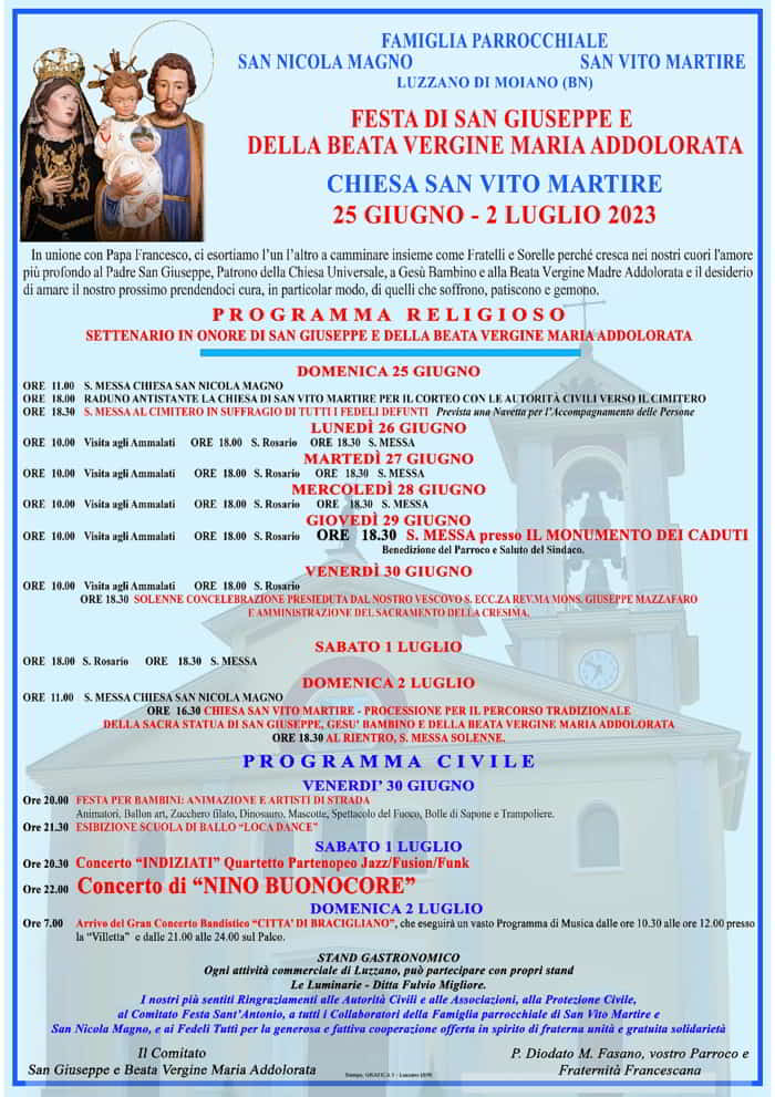 A Luzzano di Moiano, in provincia di Benevento, Festa di San Giuseppe Madonna e della Beata Vergine Maria Addolorata, dal 25 Giugno al 2 Luglio