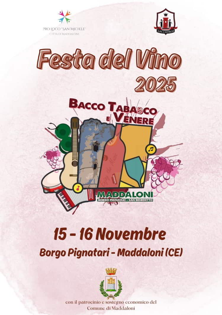 Il 15 e 16 Novembre 2025 a Maddaloni, in provincia di Caserta, la Pro Loco San Michele, organizza la Festa del Vino, nel Borgo Pignatari