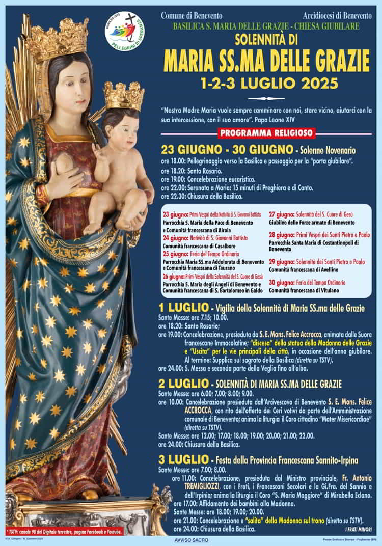 Il comune di Benevento e la Basilica della Madonna delle Grazie organizza, il 1-2-3 Luglio 2025 la Festa di Santa Maria delle Grazie.