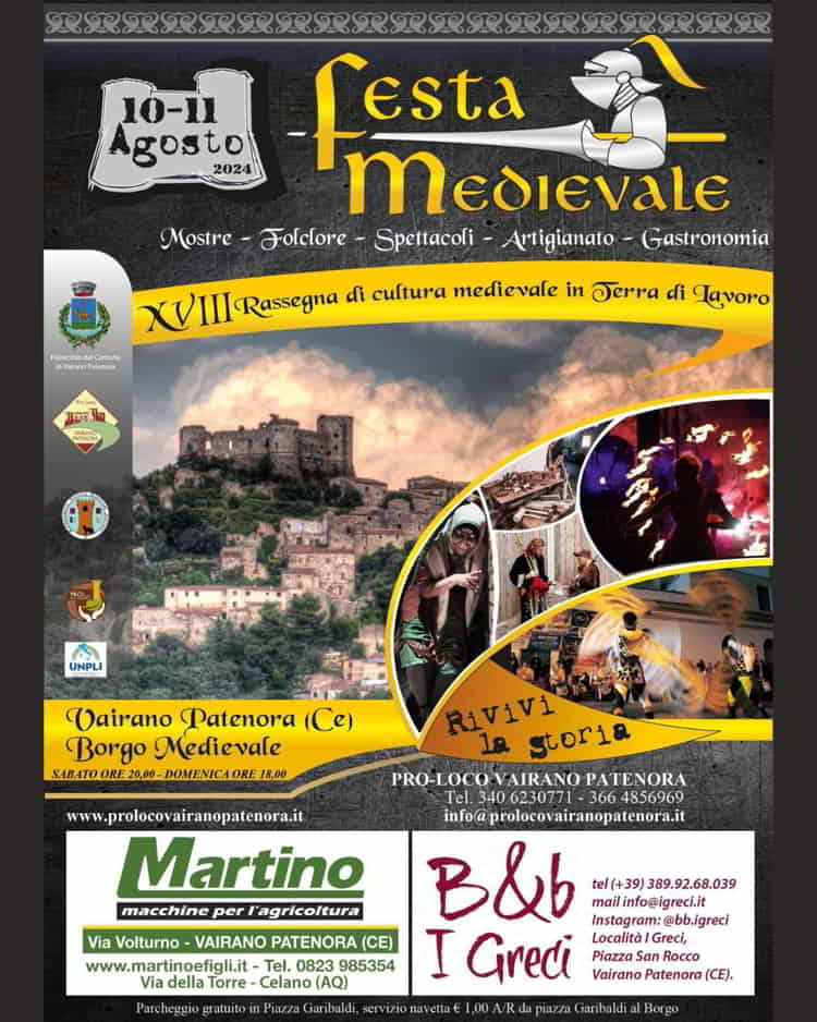 La Pro Loco presenta la Festa Medievale nel Borgo di Vairano Patenora in provincia di Caserta. La manifestazione si terrΓ nei giorni 10 e 11