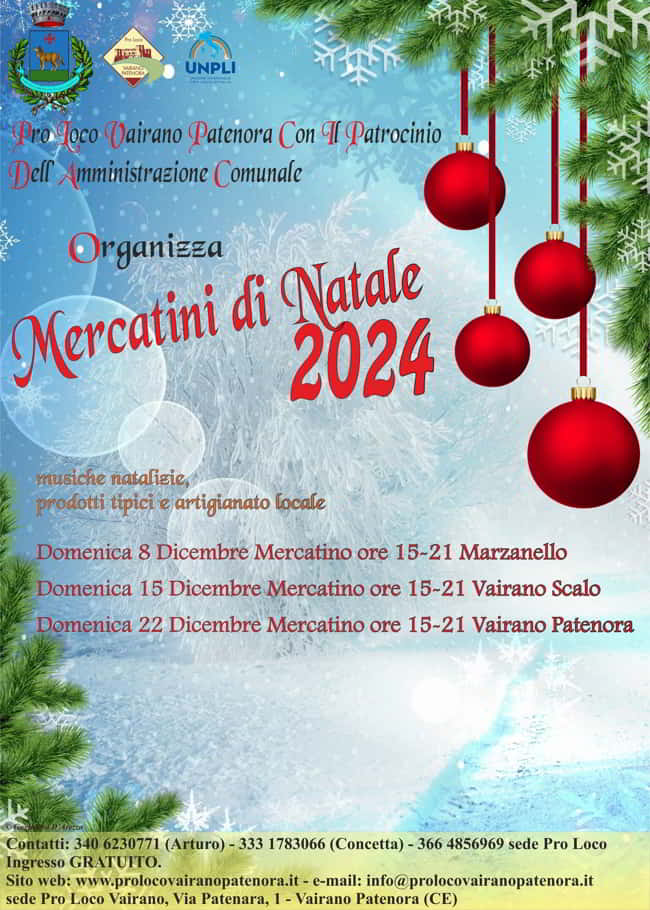 La Pro Loco organizza i mercatini di Natale, l’8 Dicembre 2024 – Marzanello, il 15 Dicembre 2024 – Vairano Scalo e il 22 Dicembre 2024