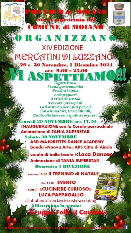 Il 29 e 30 Novembre e il giorno 1 Dicembre 2024 tornano i Mercatini di Natale a Luzzano di Moiano in provincia di Benevento. Non