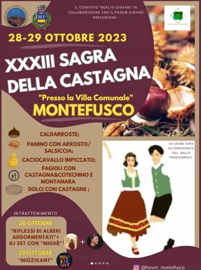 La Pro Loco di Montefusco presenta la XXXIII edizione della Sagra della Castagna. La sagra si terrà il 28 e 29 Ottobre 2023 presso la