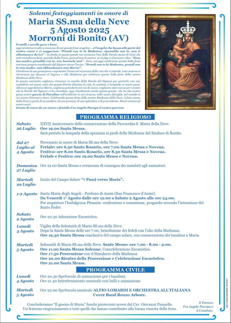 A Morroni di Bonito, in provincia di Avellino, Solenni Festeggiamenti in onore di SS.ma della Neve, programma civile 4 e 5 Agosto 2025. Si Ringrazia