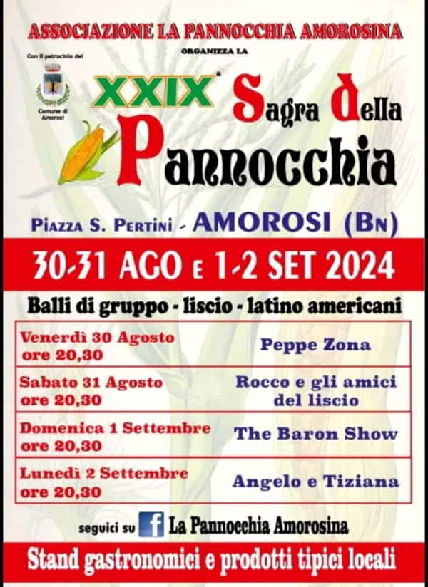 L’Associazione La Pannocchia Amorosina con il patrocinio del comune di Amorosi, presenta la XXX edizione della sagra della pannocchia Amorosina il 29-30-31 Agosto e 1