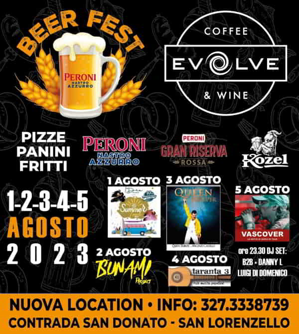 Evolve Coffee&wine organizza nella nuova location di C.da San Donato a San Lorenzello in provincia di Benevento, l’edizione 2023 del Beer Fest. Programma musicale: 1