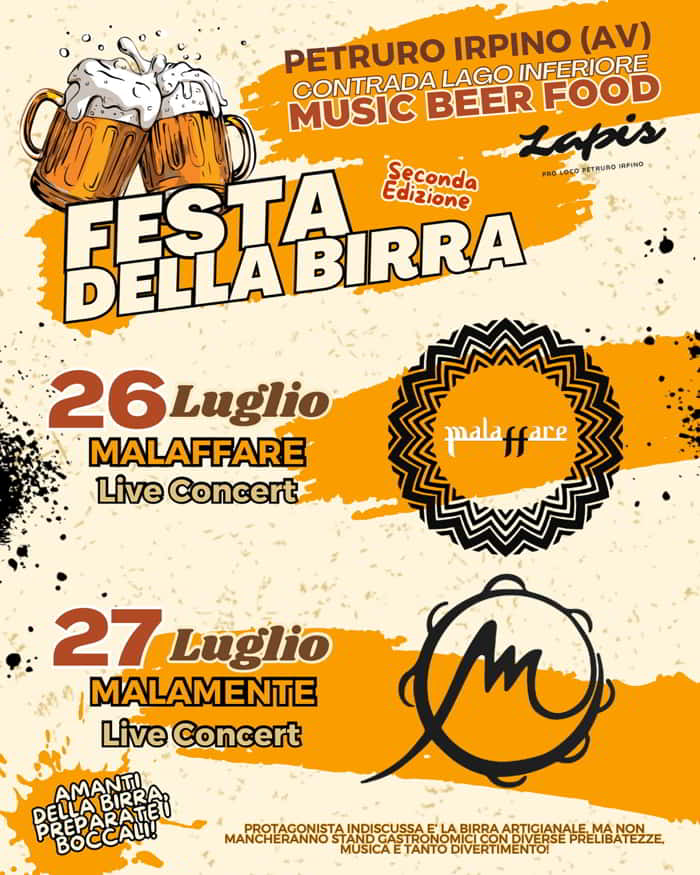 La Pro Loco Lapis presenta la seconda edizione della Festa della Birra, il 26 e 27 luglio 2025, a Petruro Irpino in provincia di Avellino.
