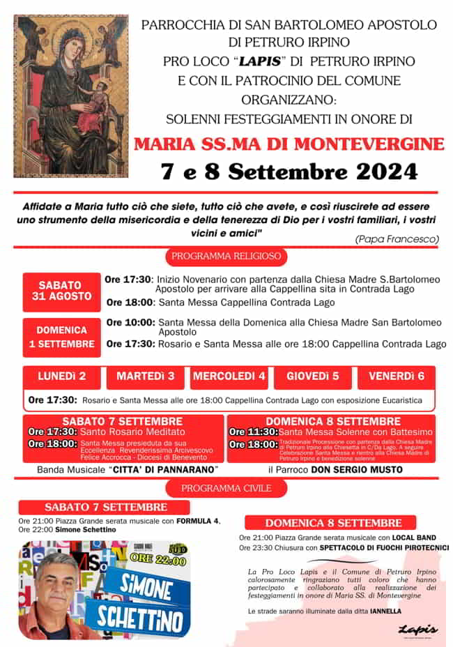 La Pro Loco Lapis e la Parrocchia di San Bartolomeo Apostolo, in occasione dei Solenni Festeggiamenti in onore di Maria SS di Montevergine, il 7