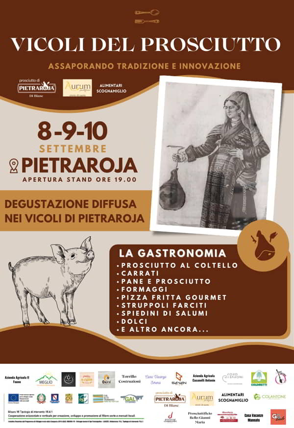 A Pietraroja in provincia di Benevento, dall’8 al 10 Settembre 2023 l’evento Vicoli del Prosciutto. Degustazione diffusa dei prodotti tipici nei vicoli del centro storico