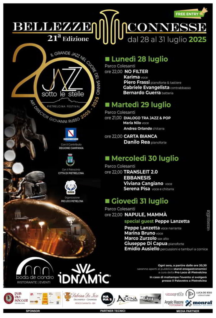 Torna, nella sua ventunesima edizione, Jazz sotto le Stelle, a Pietrelcina in provincia di Benevento. L’evento si terrΓ al Parco Colesanti da lunedΓ¬ 28 Luglio al 31 Luglio 2025