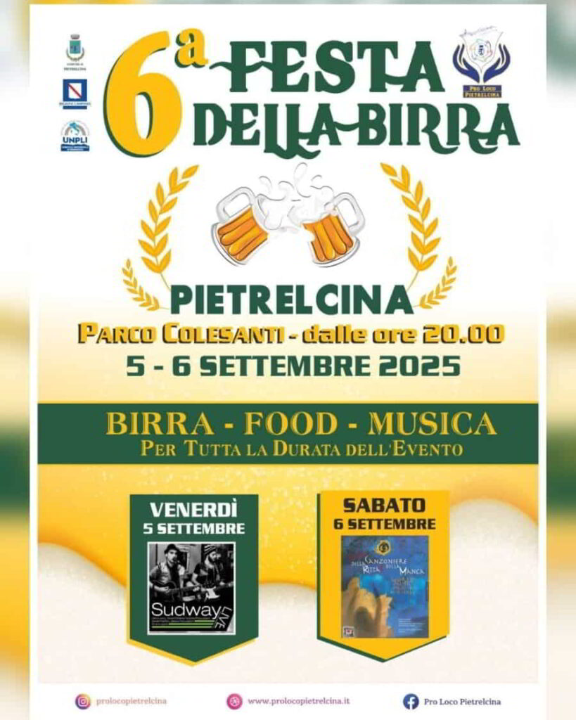 La Pro Loco di Pietrelcina organizza la Sesta Edizione della Festa della Birra, nei giorni 5-6 Settembre 2025, presso il parco Colesanti. L’evento all’insegna di tante birre diverse da assaggiare e del buon cibo che troverete nei tanti stands gastronomici, il tutto accompagnato da tanta tanta musica.