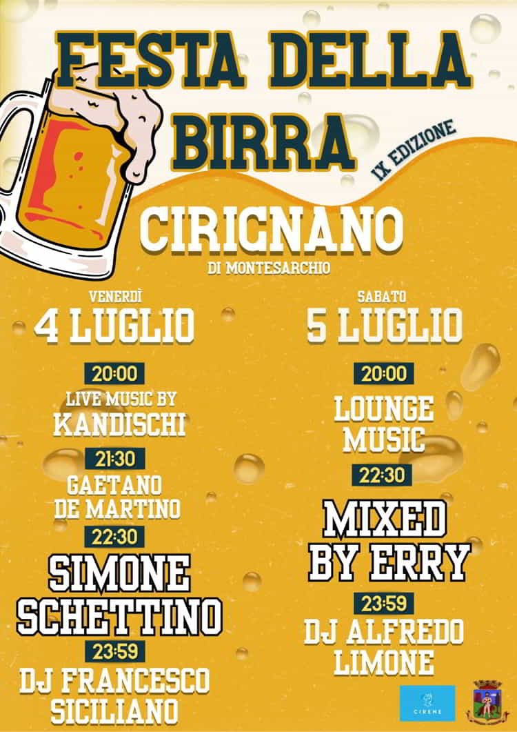 A Cirignano, frazione di Montesarchio (Bn), torna con la IX edizione a festa della Birra. Programma: 4 Luglio dalle ore 20:00, Live Music by Kandischi;