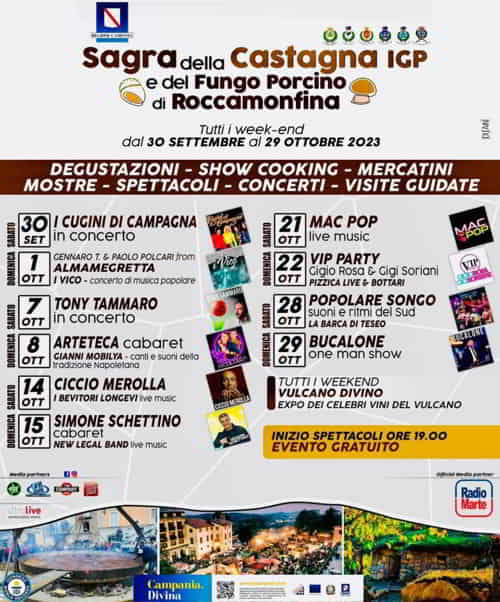Dal 30 al settembre al 29 Ottobre 2023 tutti i fine settimana, a Roccamonfina in provincia di Caserta torna la Sagra della Castagna IGP e del Fungo Porcino di Roccamonfina. Programma: 30 Settembre: concerto Cugini di Campagna; 1 Ottobre: Almanegretta – I Vico; 7 Ottobre: Tony Tammaro; 8 Ottobre: Arteteca Cabarete – Gianni Mobilya; 14 […]