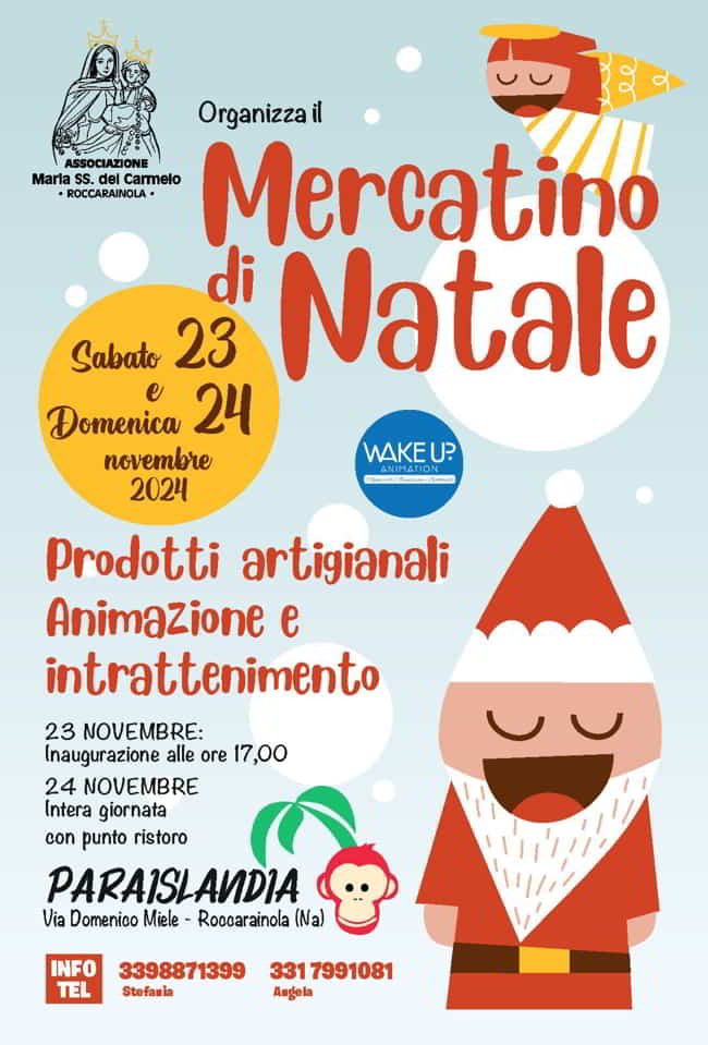 L’Associazione Maria SS del Carmelo organizza il Mercatino di Natale, il 23 e 24 Novembre 2024 a Roccarainola Non perderti altri eventi natalizi! Segui loΒ speciale