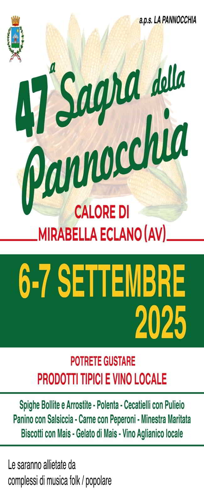 A Calore di Mirabella Eclano in provincia di Avellino, andrΓ di scena la 47Β° edizione della Sagra della Pannocchia, il 6 e 7 Settembre 2025.