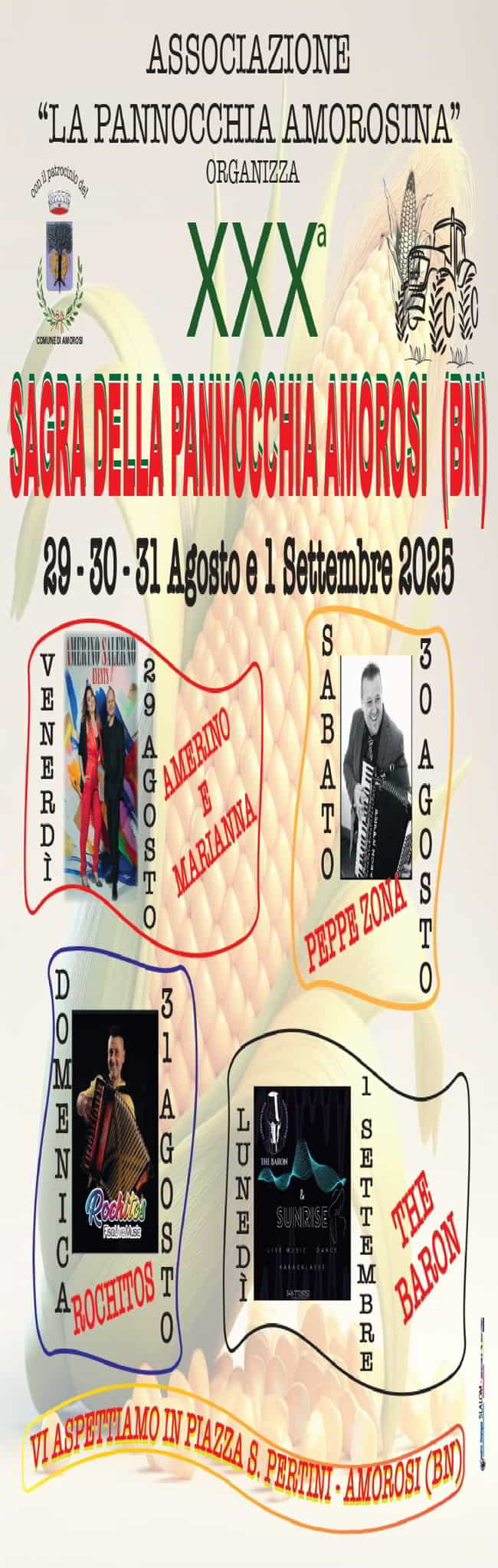 L’Associazione La Pannocchia Amorosina con il patrocinio del comune di Amorosi, presenta la XXX edizione della sagra della pannocchia Amorosina il 29-30-31 Agosto e 1