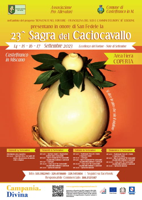L’Associazione Pro Allevatori e il Comune di Castelfranco in Miscano presentano la 23esima edizione della Sagra del Caciocavallo, il 14-15-16 e 17 Settembre 2023.