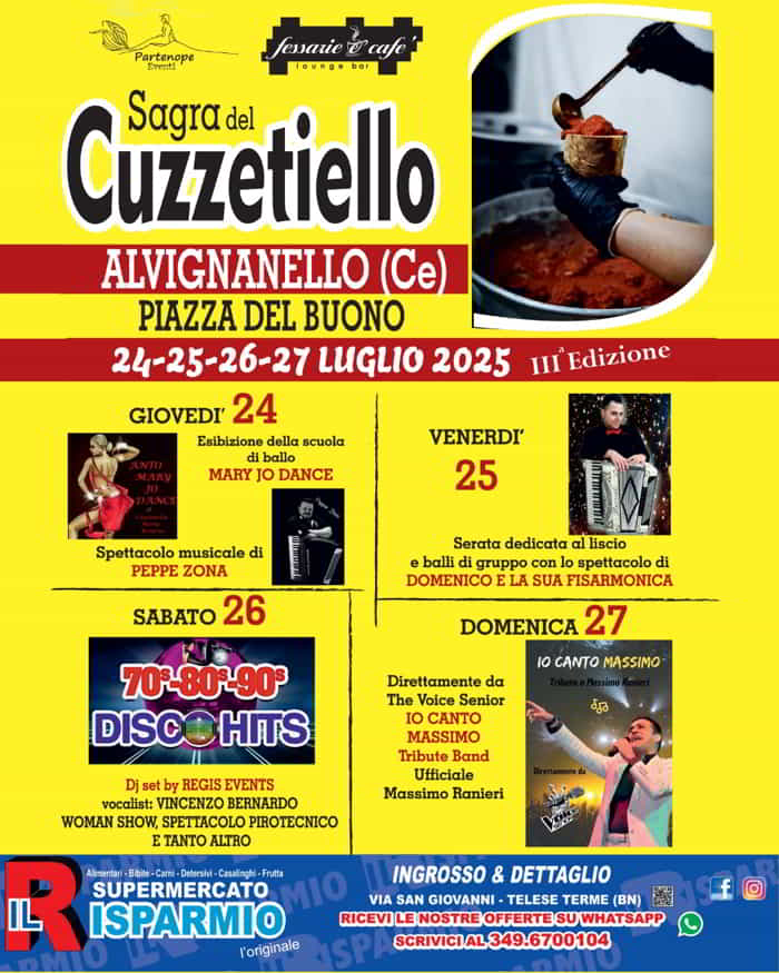 Ad Avignanello in provincia di Caserta, dal 24 al 27 Luglio 2025, il Lounge Bar Fessarie ‘e CafΓ¨ organizza la Sagra del Cuzzetiello.