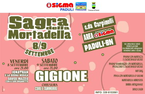 La pro loco e il comune di Paduli presentano la Sagra della Mortadella artigianale, prodotta da Rubino Salumi. Nel corso di questi giorni sarร mostrata