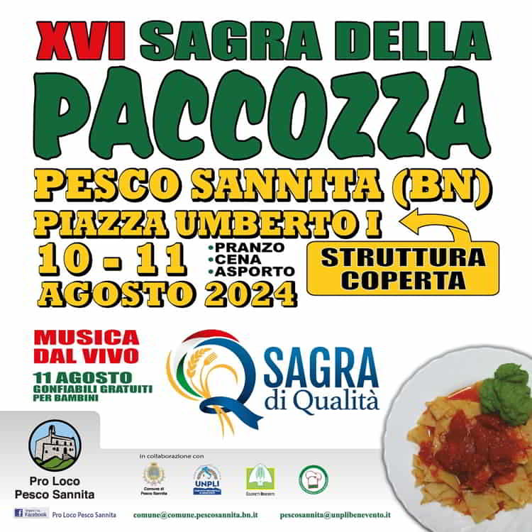 Torna a Pesco Sannita in provincia di Benevento la XVI edizione della Sagra della Paccozza, eletta una delle Sagre di Qualità. Il 10 e 11 Agosto 2024 (pranzo-cena-asporto). Struttura coperta, musica dal Vivo e gonfiabili.