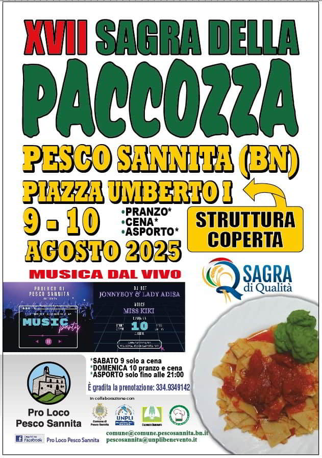 Torna a Pesco Sannita in provincia di Benevento la XVII edizione della Sagra della Paccozza. Il 9 e 10 Agosto 2025 (pranzo-cena-asporto). Struttura coperta, musica dal Vivo e gonfiabili.