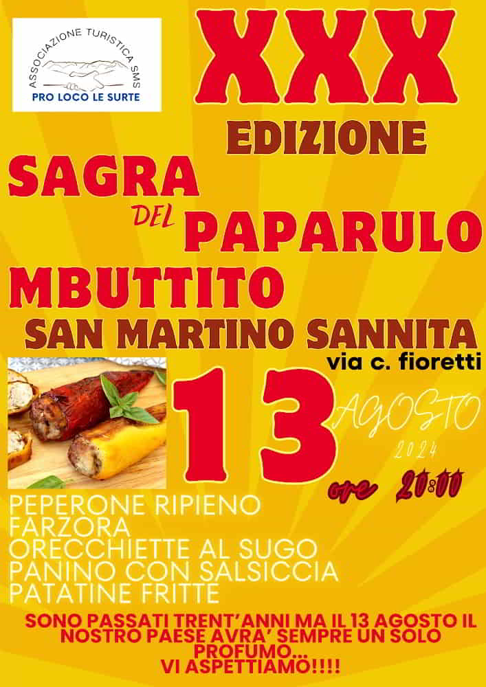 La Pro Loco Suerte presenta la XXX edizione della Sagra del Paparulo Mbuttito, il 13 Agosto 2024 a San Martino Sannita Provincia di Benevento.