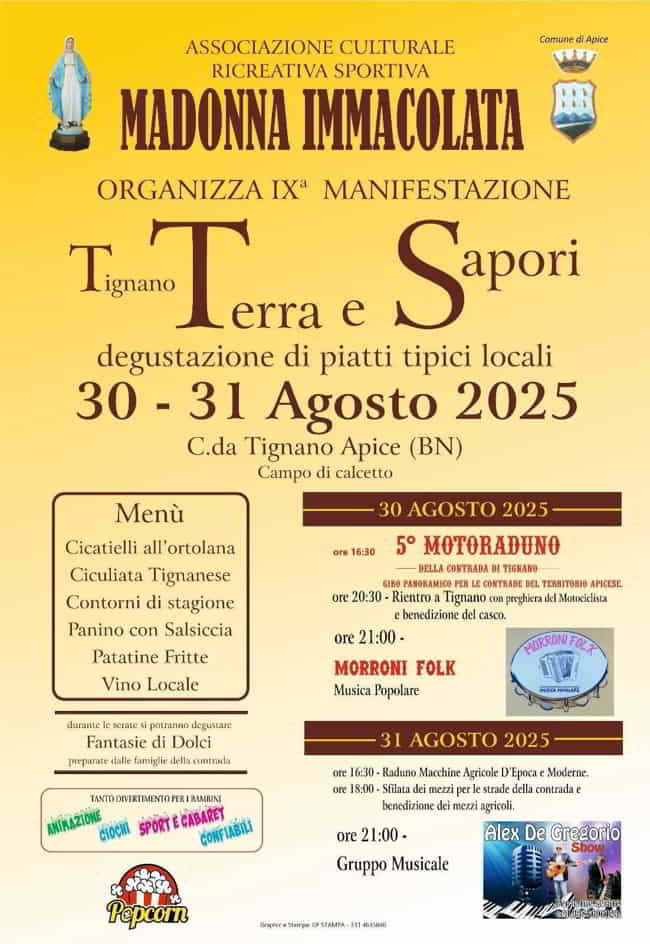Il 5, 6 e 7 Settembre 2025, ad Apice in provincia di Benevento, la Pro Loco organizza la 12esima edizione della Sagra degli Orti Apicesi.