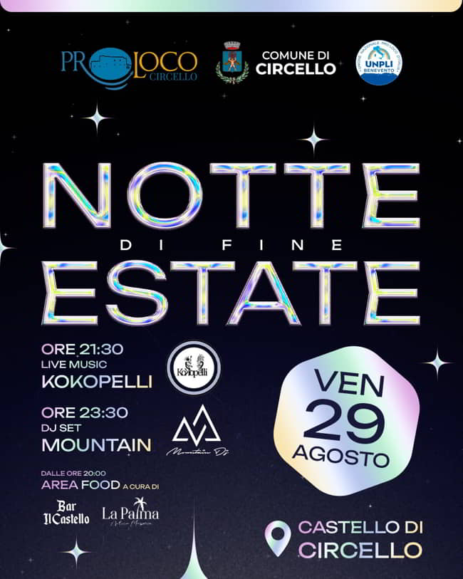 La Pro Loco organizza la Notte di Fine Estate. VenerdΓ¬ 29 Agosto 2025 presso il Castello di Circello in provincia di BeenventoLive Music – @kokopelli_officialDj