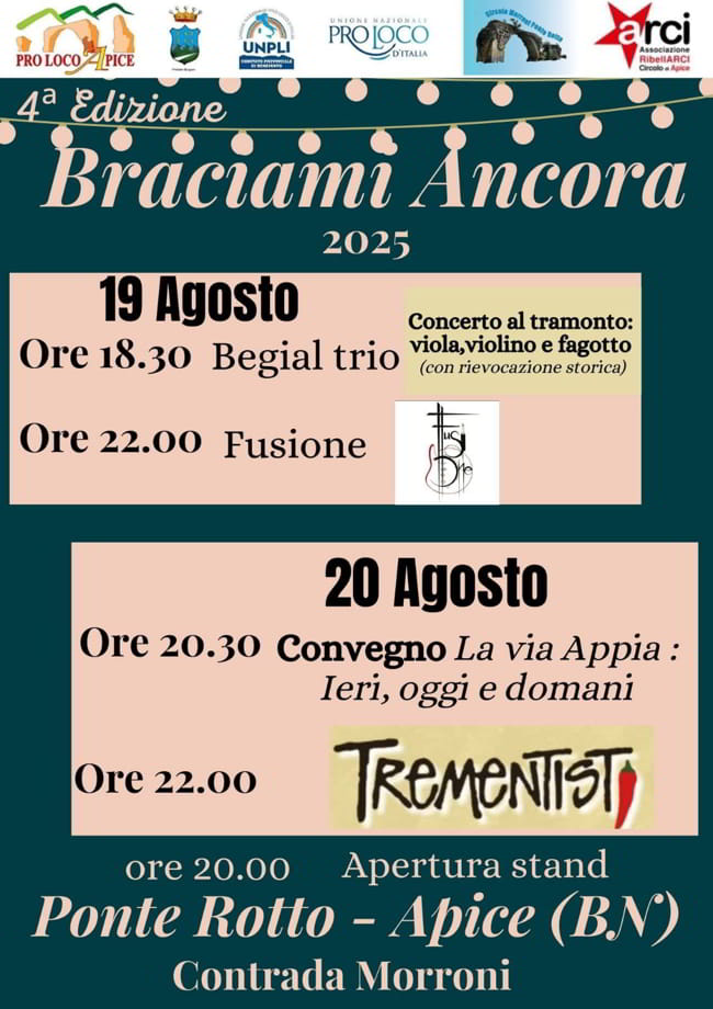 La Pro Loco di Apice presenta il 20 Agosto 2025 una nuova data per l’evento Braciami Ancora. L’evento, giunto alla 4° edizione, si terrà in