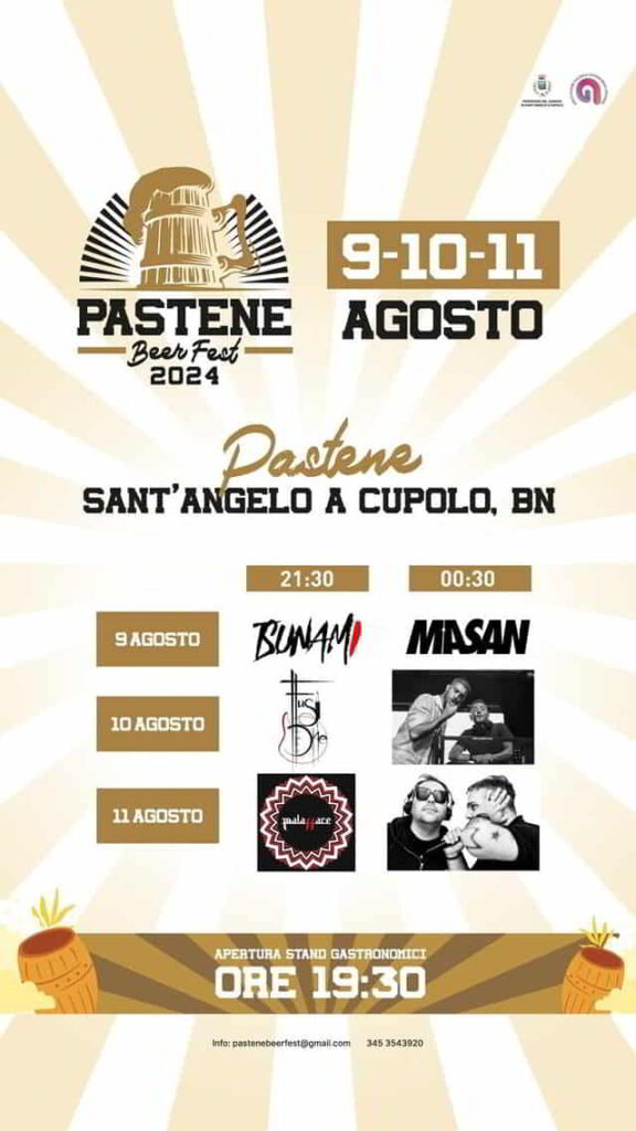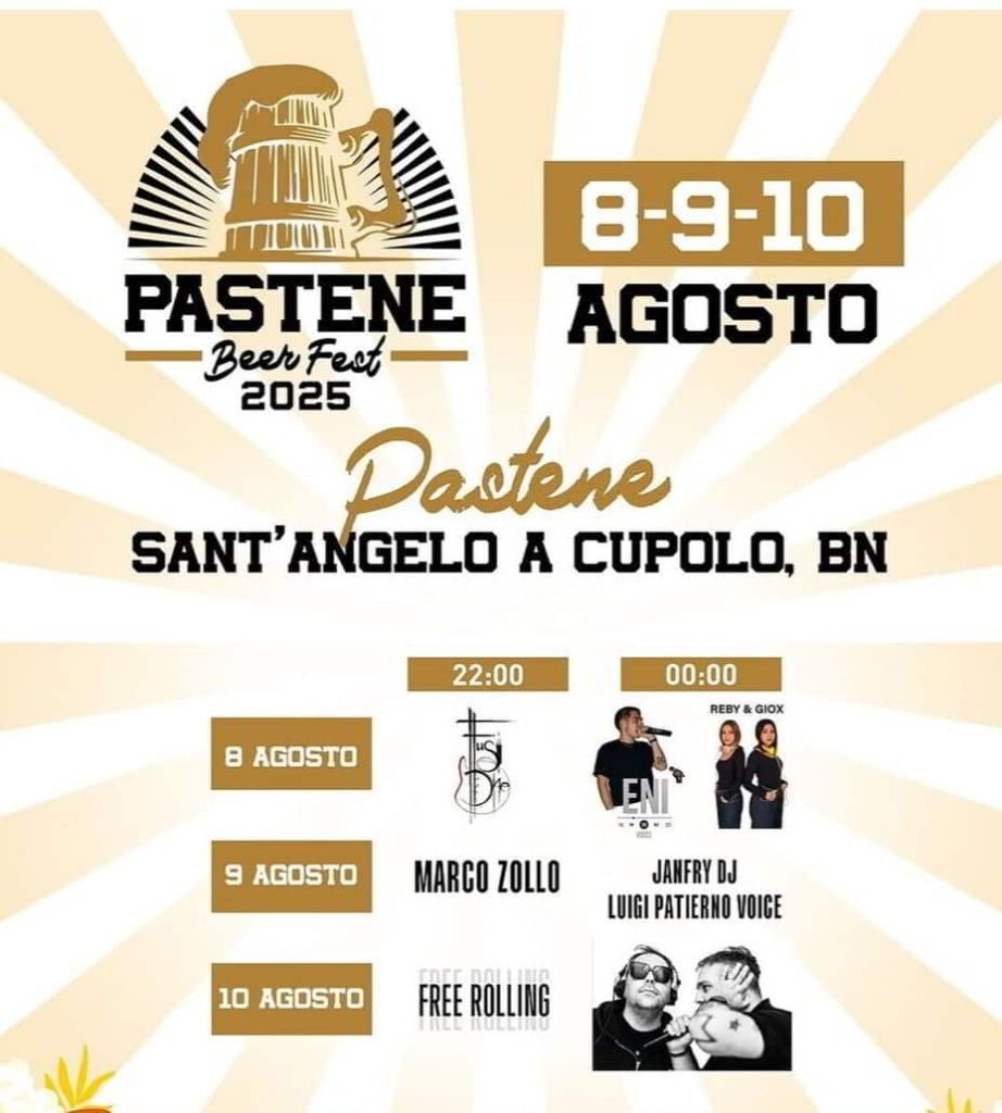 Nei giorni 8-9 e 10 Agosto 2025 a Pastene frazione di Sant’Angelo a Cupolo, in provincia di Benevento, torna il Pastene Beer Fest.