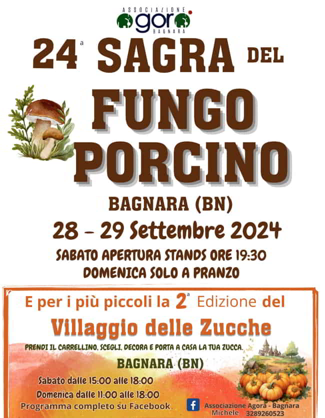 L’Associazione Agorà – Bagnara, presenta la 24esima edizione della Sagra del Fungo Porcino a Bagnara in provincia di Benevento, il 28 e 29 Settembre 2024 (Domenica solo a Pranzo). Per i più piccoli seconda edizione del Villaggio delle Zucche.