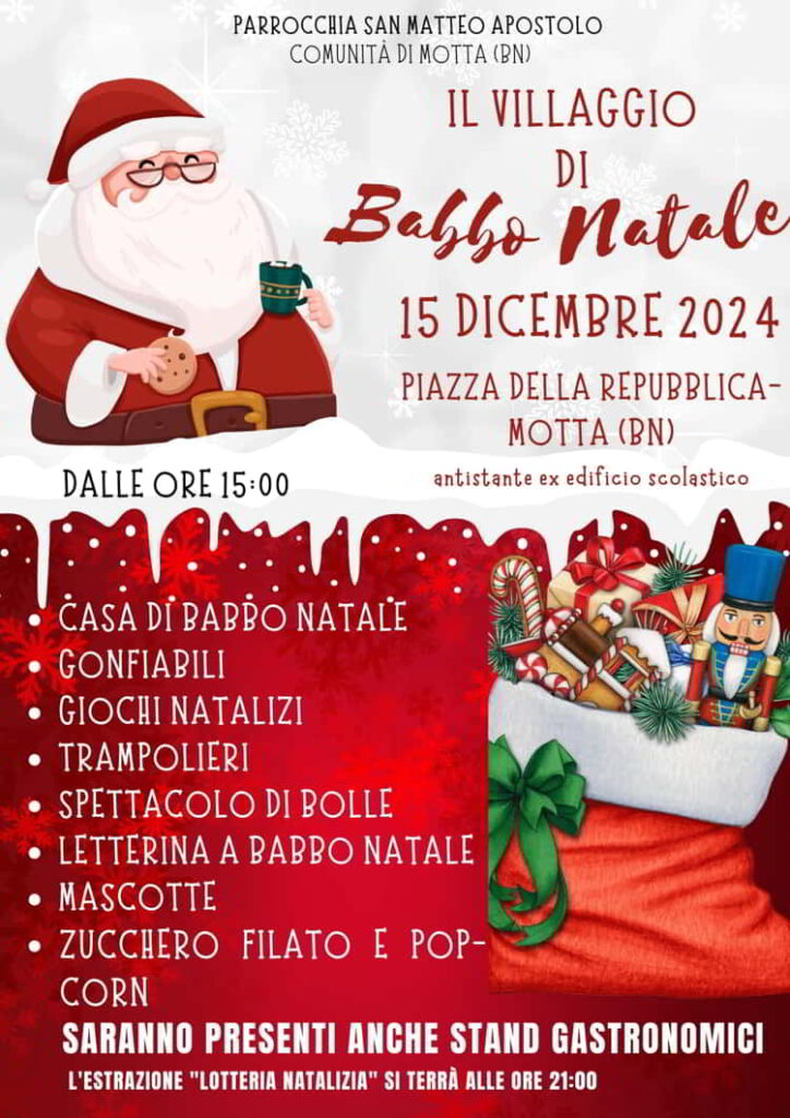 La Parrocchia San Matteo Apostolo della Comunità di Motta (Frazione di Sant’Angelo a Cupolo), organizza il Villaggio di Babbo Natale, il 15 Dicembre in piazza della Repubblica. Non perderti altri eventi natalizi! Segui lo speciale Eventi Natalizi, Mercatini E Non Solo Edizione 2024/2025.