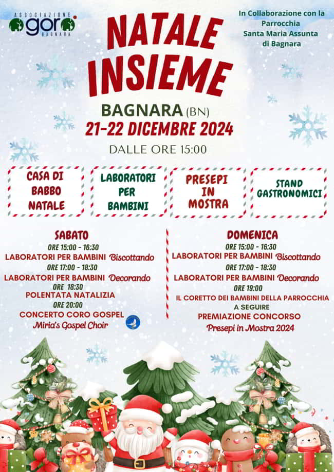 L’Associazione Agorà di Bagnara con la collaborazione della Parrocchia Santa Maria Assunta di Bagnara, organizza il Natale Insieme, il 21 e 22 Dicembre 2024 dalle ore 15:00. Non perderti altri eventi natalizi! Segui lo speciale Eventi Natalizi, Mercatini E Non Solo Edizione 2024/2025.