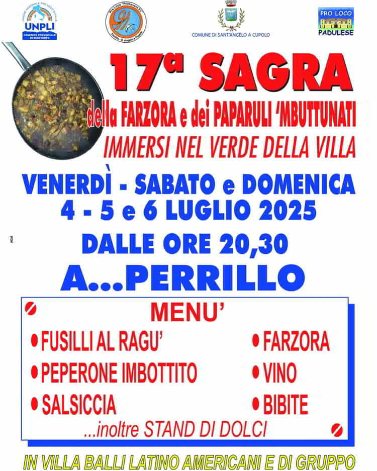 La Pro Loco Primavera ’91 presenta la 17 esima edizione della Sagra della Farzora e dei Paparuli ‘Mbuttunati. La sagra si terrà nei giorni 4-5-6 Luglio 2025, nella villa comunale di Perrillo – Sant’Angelo a Cupolo (Bn)