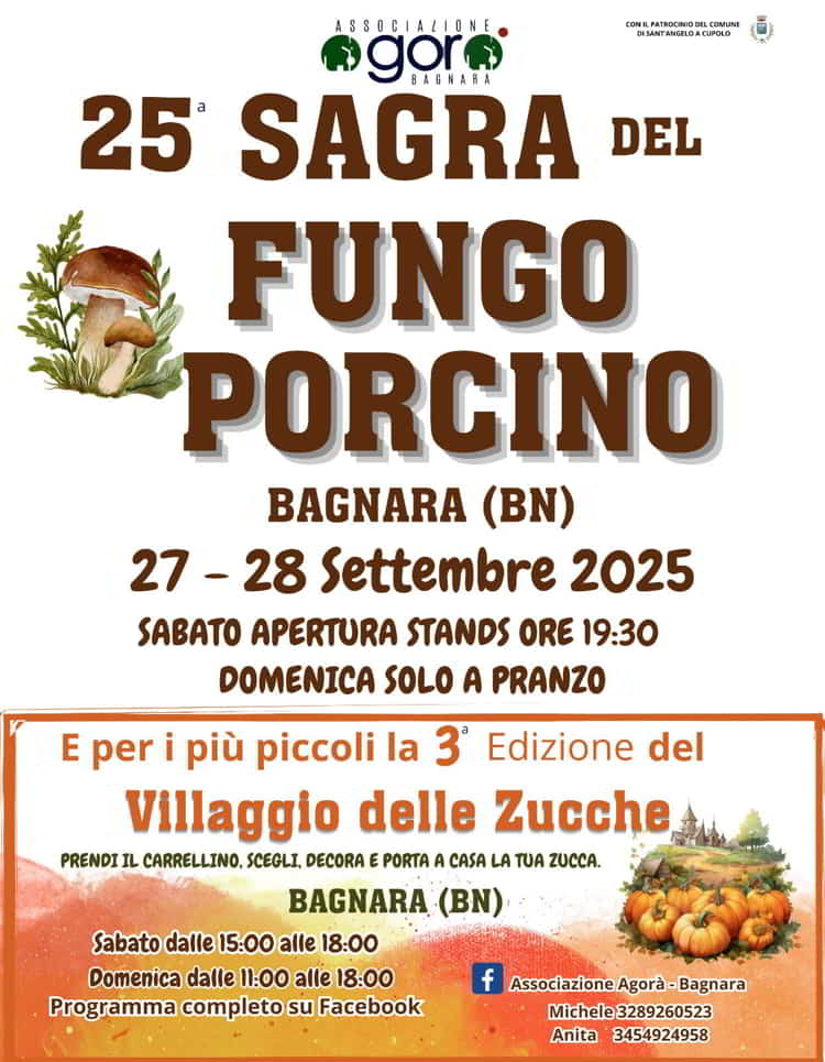 L’Associazione Agorà – Bagnara, presenta la 25esima edizione della Sagra del Fungo Porcino a Bagnara in provincia di Benevento, il 27 e 28 Settembre 2025 (Domenica solo a Pranzo). Per i più piccoli seconda edizione del Villaggio delle Zucche.
