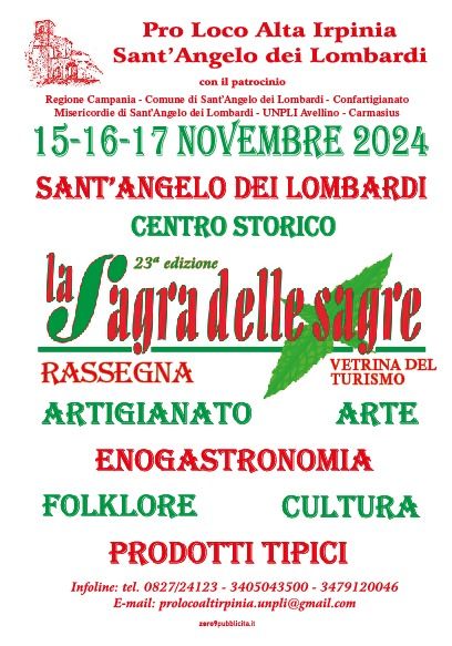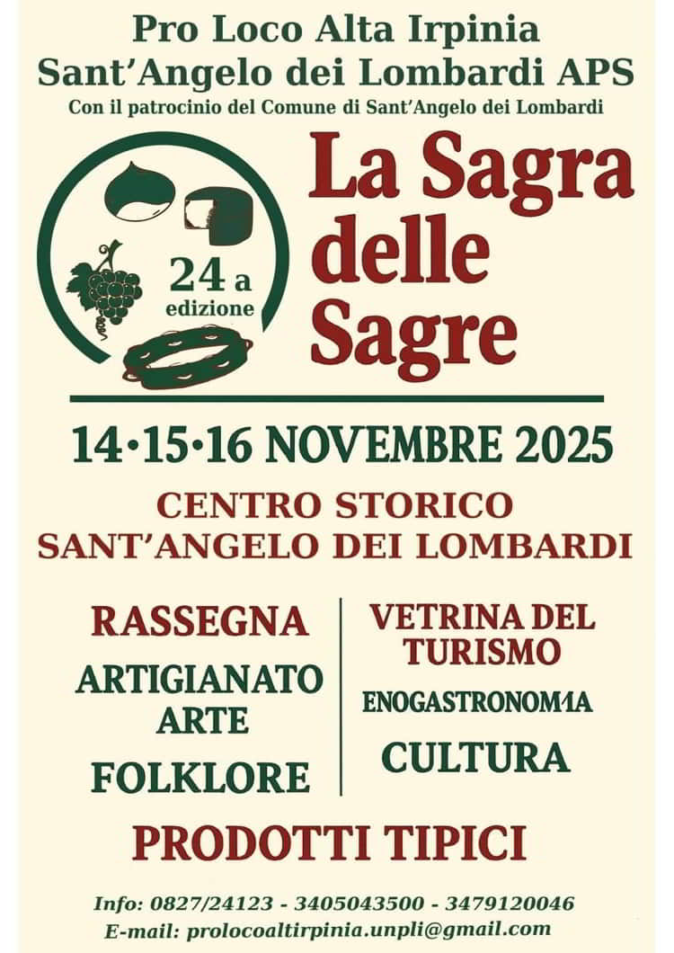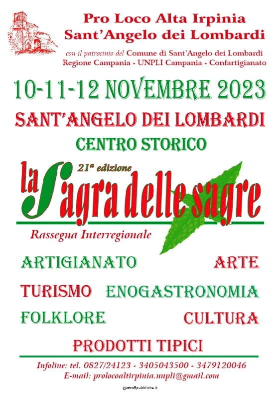 Nei giorni 15, 16 e 17 novembre 2024, si svolgerà a Sant’Angelo dei Lombardi “La Sagra delle Sagre”, un evento che celebra la gastronomia, l’artigianato