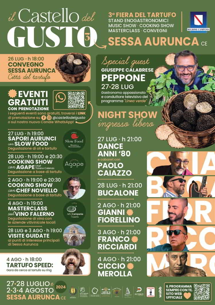 Aย Sessa Aurunca, in provincia di Caserta,ย torna l’evento Il Castello del Gusto: sabato 27 e domenica 28 luglio terza fiera del tartufo con stand gastronomici, music