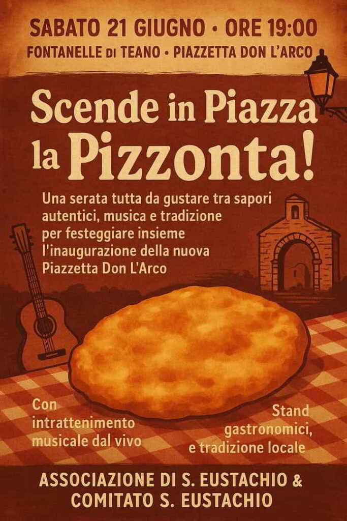 L’Associazione Sant’Eustacchio, presenta l’evento Scende in Pizza la Pizzonta, a Fontanelle di Teano in provincia di Caserta. Una serata tutta da gustare con sapori autentici, musica e tradizione per festeggiare insieme l’inaugurazione della nuova Piazzetta Don L’Arco