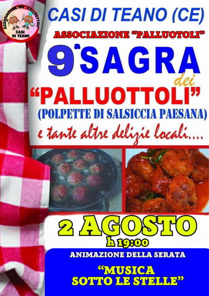 L’Associazione Palluottoli organizza la nona edizione della Sagra dei “Palluottoli”, polpette di pane con salsiccia paesana. La sagra si svolgerà sabato 2 Agosto alle ore 20:00 in località Casi frazione di Teano provincia di Caserta. La serata sarà allietata da musica dal vivo.