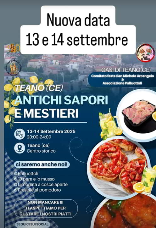 L’evento è stato rinviato al 13 e 14 Settembre 2025. A Teano, in provincia di Caserta, andrà di scena la XXIII edizione di Antichi sapori e antichi mestieri, il 23 e 24 Agosto 2025.