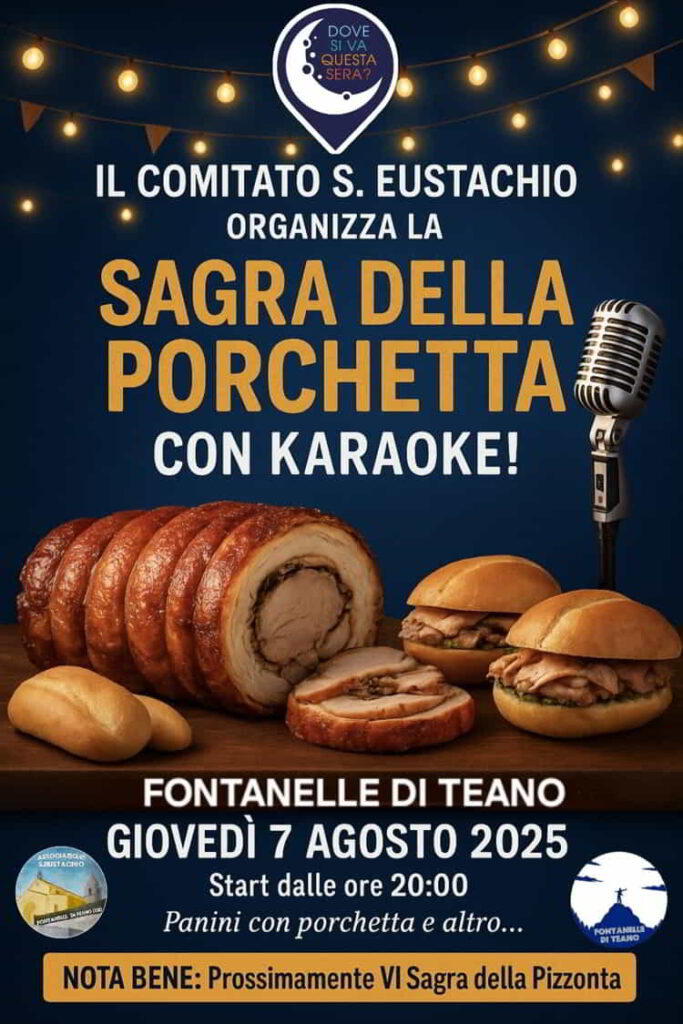 Il Comitato Sant’Eustacchio organizza la Sagra della Porchetta, a Fontanelle di Teano in provincia di Caserta, il 7 Agosto 2025. Start ore 20.00. Nota Bene: prossimamente Sagra della Pizzonta.
