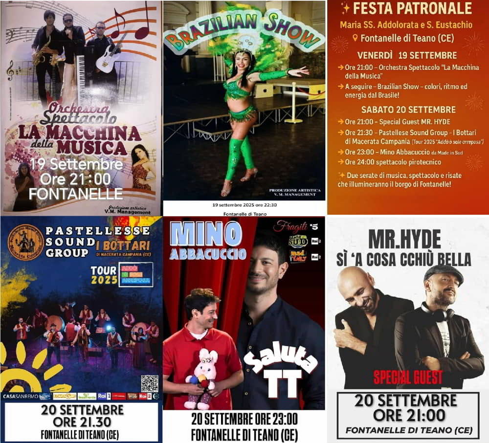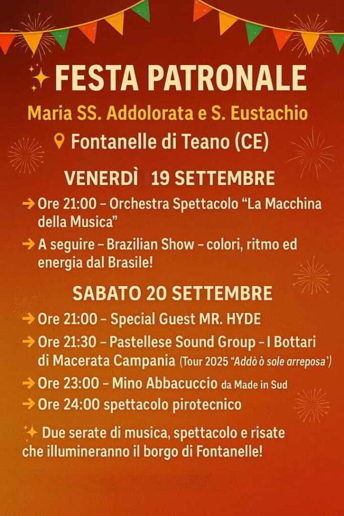 Fontanelle di Teano in provincia di Caserta si prepara a vivere due giornate indimenticabili di musica, comicità e tradizione in occasione della Festa Patronale dedicata a Maria SS. Addolorata e S. Eustachio, in programma il 19 e 20 settembre 2025. Venerdì 19 settembre, la festa inizierà con: Ore 21:00 – Orchestra Spettacolo “La Macchina della […]