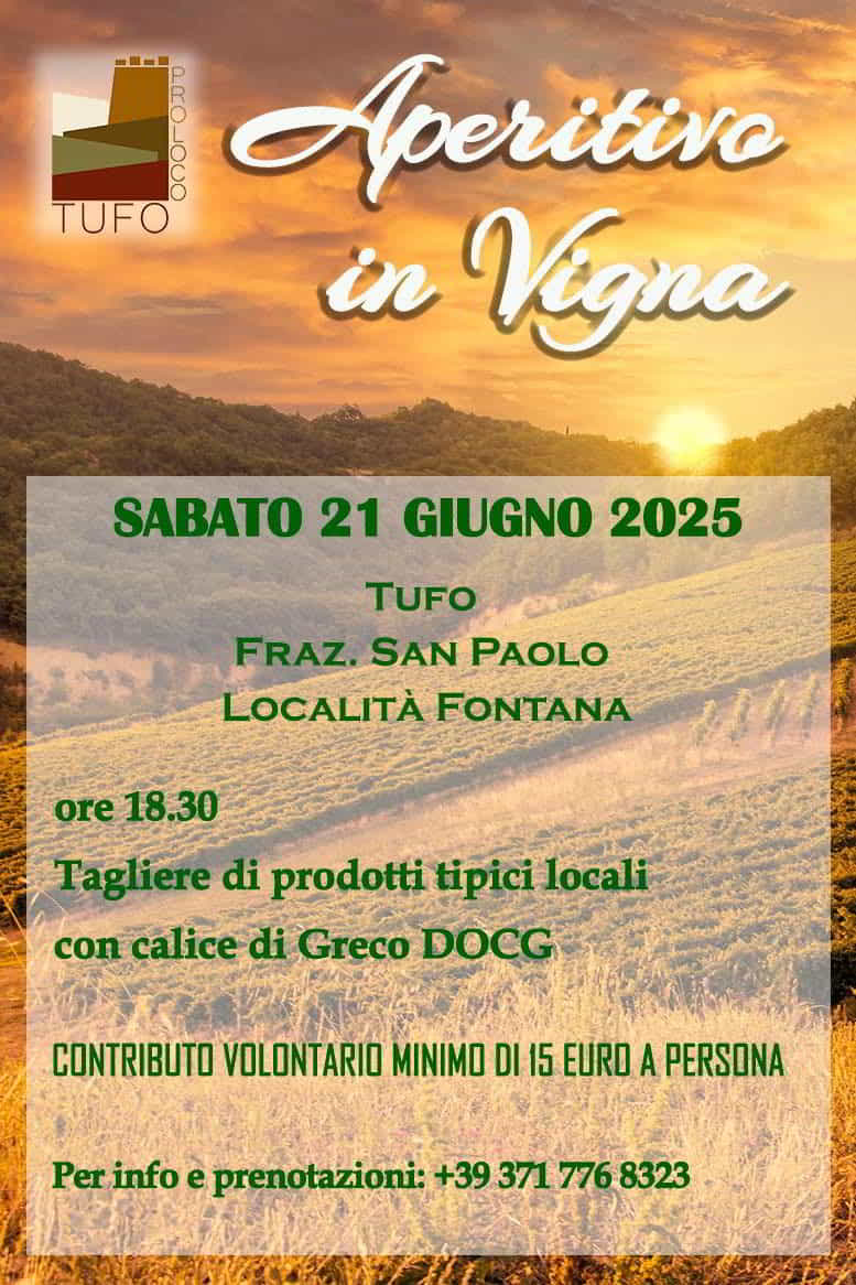 La Pro Loco, organizza Aperitivo in Vigna, il 21 Giugno 2025 a Tufo in provincia di Avellino, LocalitΓ Fontana, Fraz. San Paolo, Cantine Cennerazzo. Contributo