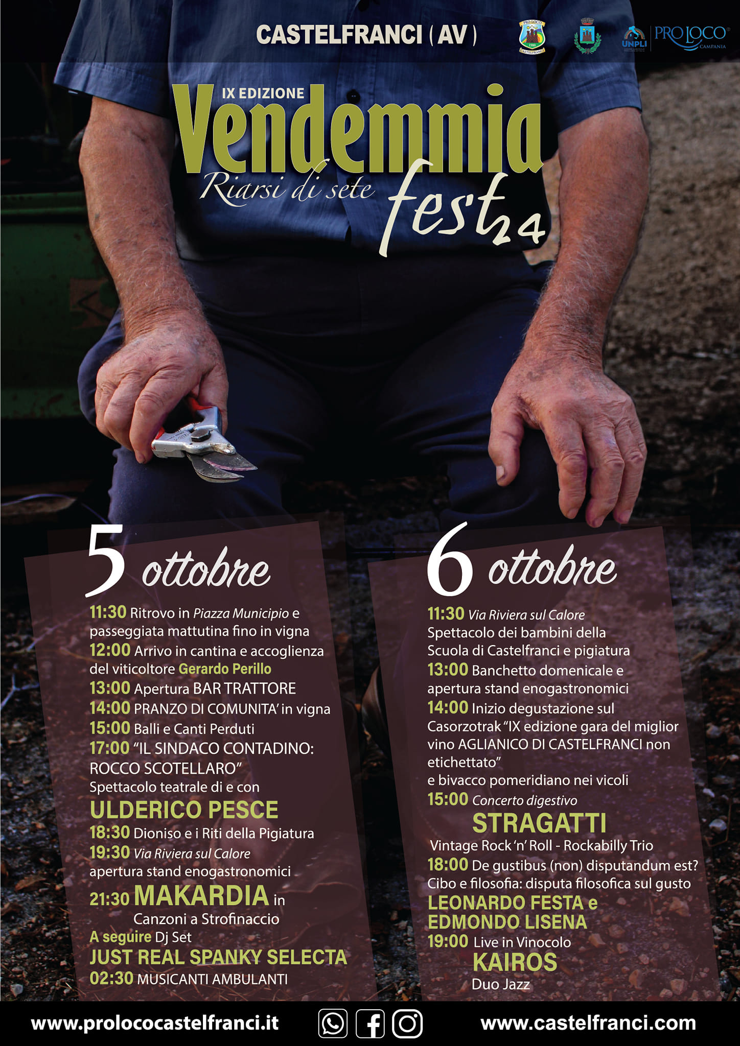 La Pro Loco presenta la IX Edizione di Vendemmia Fest Riarsi di Sete. La manifestazione si terrร il 5 e 6 Ottobre 2024 a Castelfranci